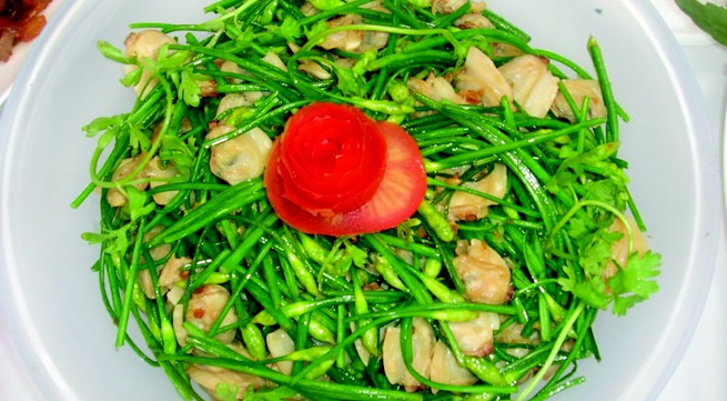 Nghêu xào hoa hẹ có tác dụng bổ thận, thanh nhiệt khai uất, trừ phiền, có ích cho người bị loãng xương